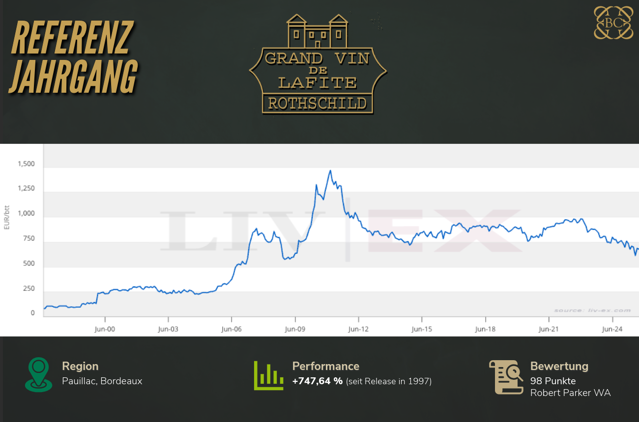 Eine ähnliche Entwicklung verzeichnet der Château Lafite Rothschild 1996, der inzwischen „nur“ noch mit 98 Punkten von Robert Parker WA bewertet wird, und bei seiner Veröffentlichung für umgerechnet ca. 80,00 € auf dem Markt erschien. Dieser verbuchte innerhalb von 28 Jahren eine Wertsteigerung von 747 %.